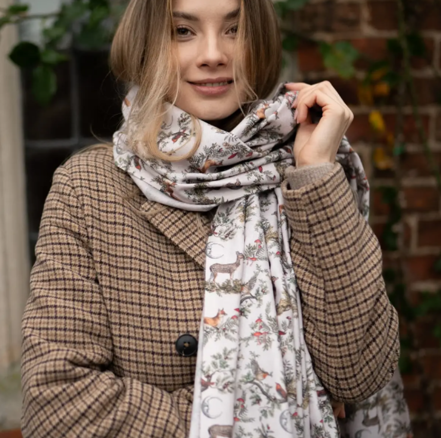 Evoke the romance of a medieval tale with the A Night's Tale Woodland Scarf in Crystal Grey. Inspired by Chaucer's 'The Knight's Tale', the A Night's Tale print is set on a winter's night, beneath the moon where our furry & feathered friends gather to tell secrets of nature's wonder.