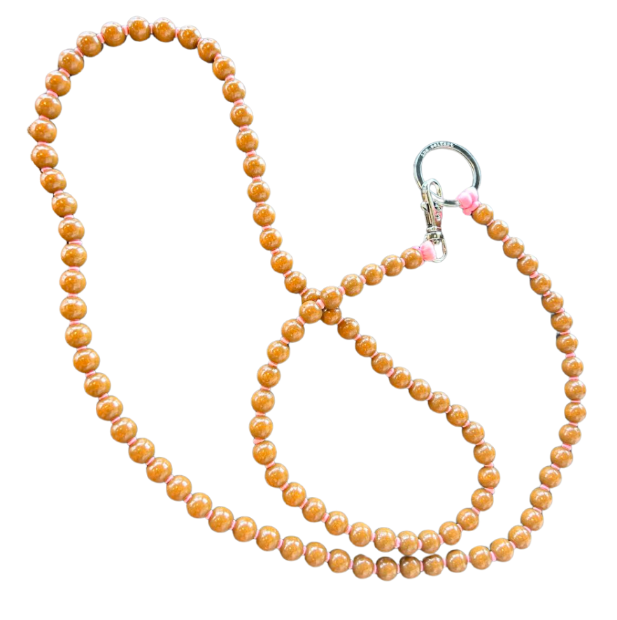 Phone necklace with elastic band and threaded wooden beads. Adapter included.