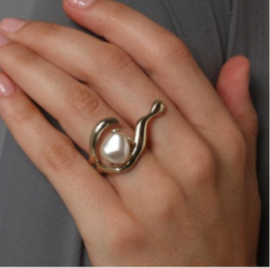 This unique Kalliope Pearl Ring has a light cream rose pearl, handcrafted in Greece with high-quality brass. Its one-of-a-kind design adds a special touch to any outfit.
