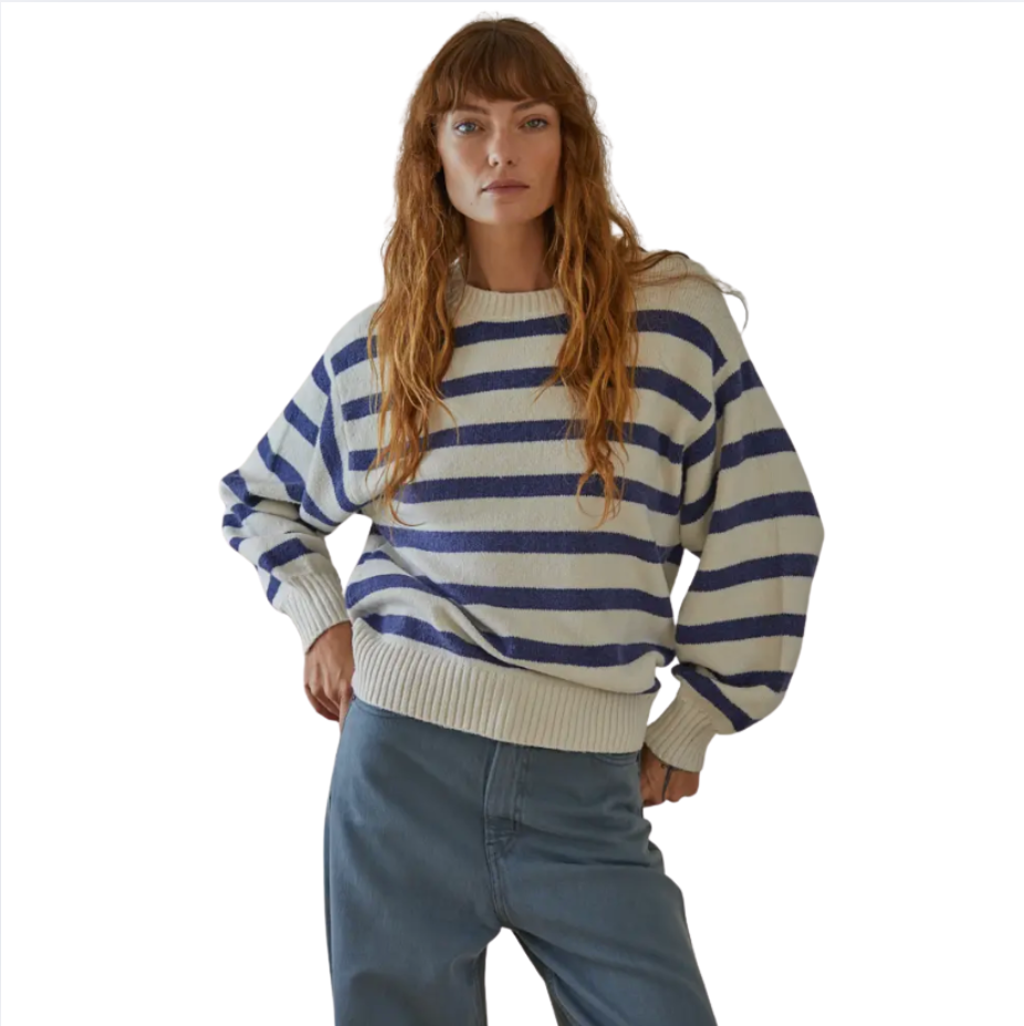 This oversized striped knit sweater features a crew neck and long sleeves with a relaxed drop shoulder design, offering both comfort and effortless style. Crafted from a soft, breathable knit fabric, it provides warmth without sacrificing breathability, making it ideal for layering in cooler weather. Its bold stripes and loose fit make it a versatile piece that pairs well with casual or smart-casual outfits, perfectly combining modern trends with timeless comfort.